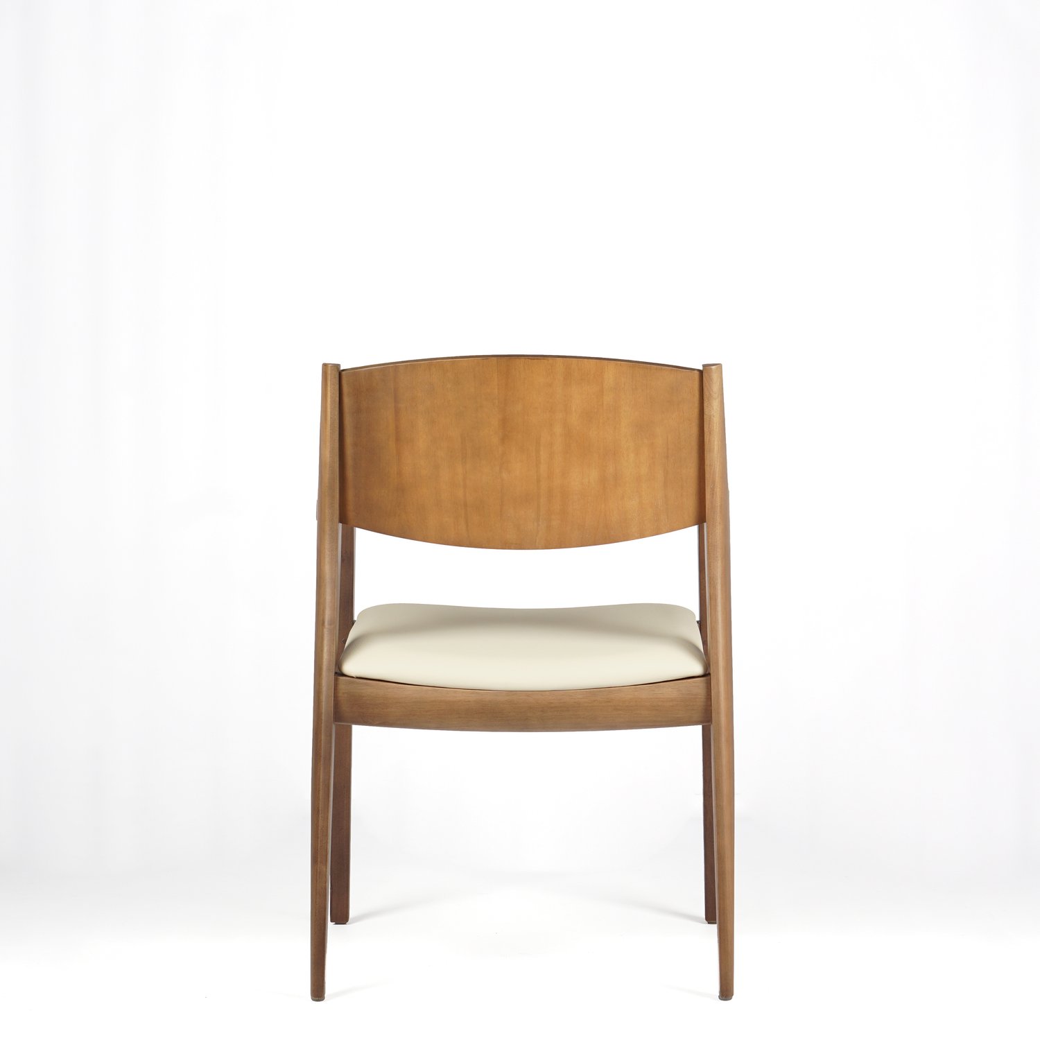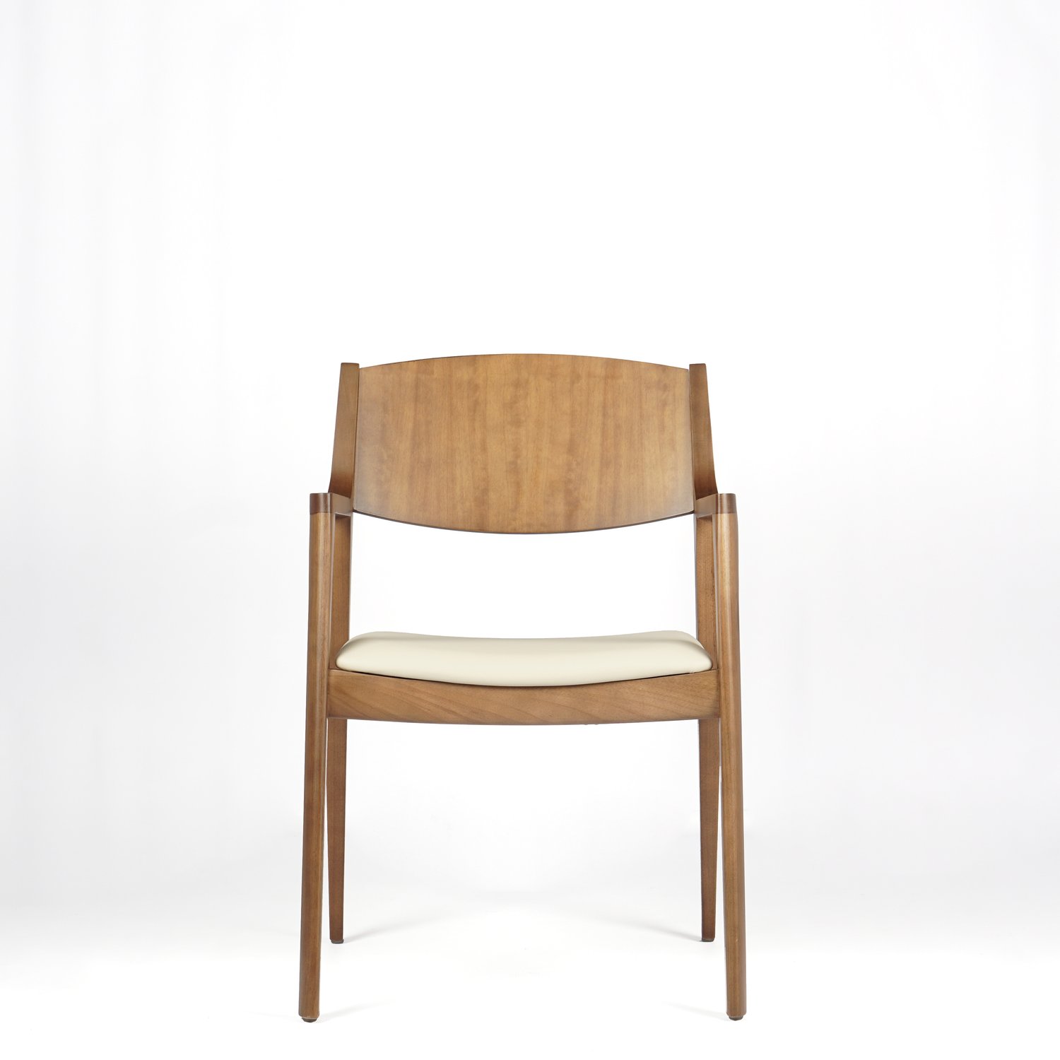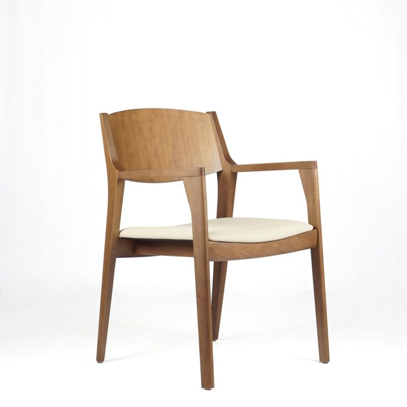 Silla con brazos FLORES en madera color CAPUCCINO y asiento en piel sintética color OCRE y BEGE.