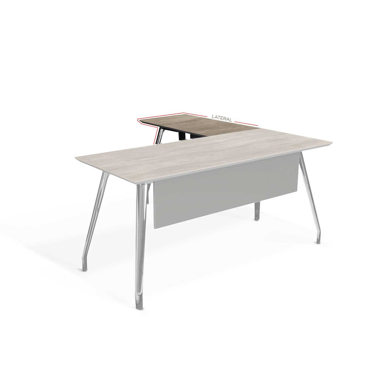Adaptación Lateral APEX con tope color bisón/gris de 1.00m x 0.50m y base tubular con patas de aluminio cromado negro.