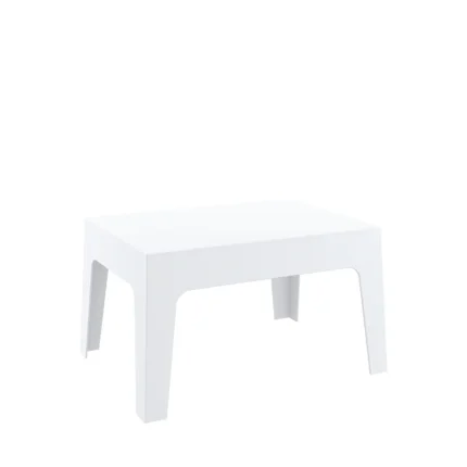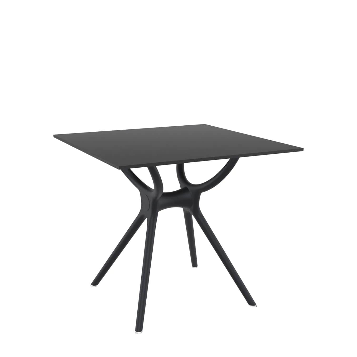Mesa con tope laminado HPL de 0.80m x 0.80m y base en polipropileno. Disponible en blanco y negro. Desarmable.