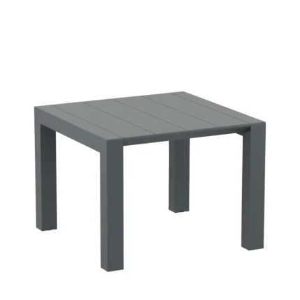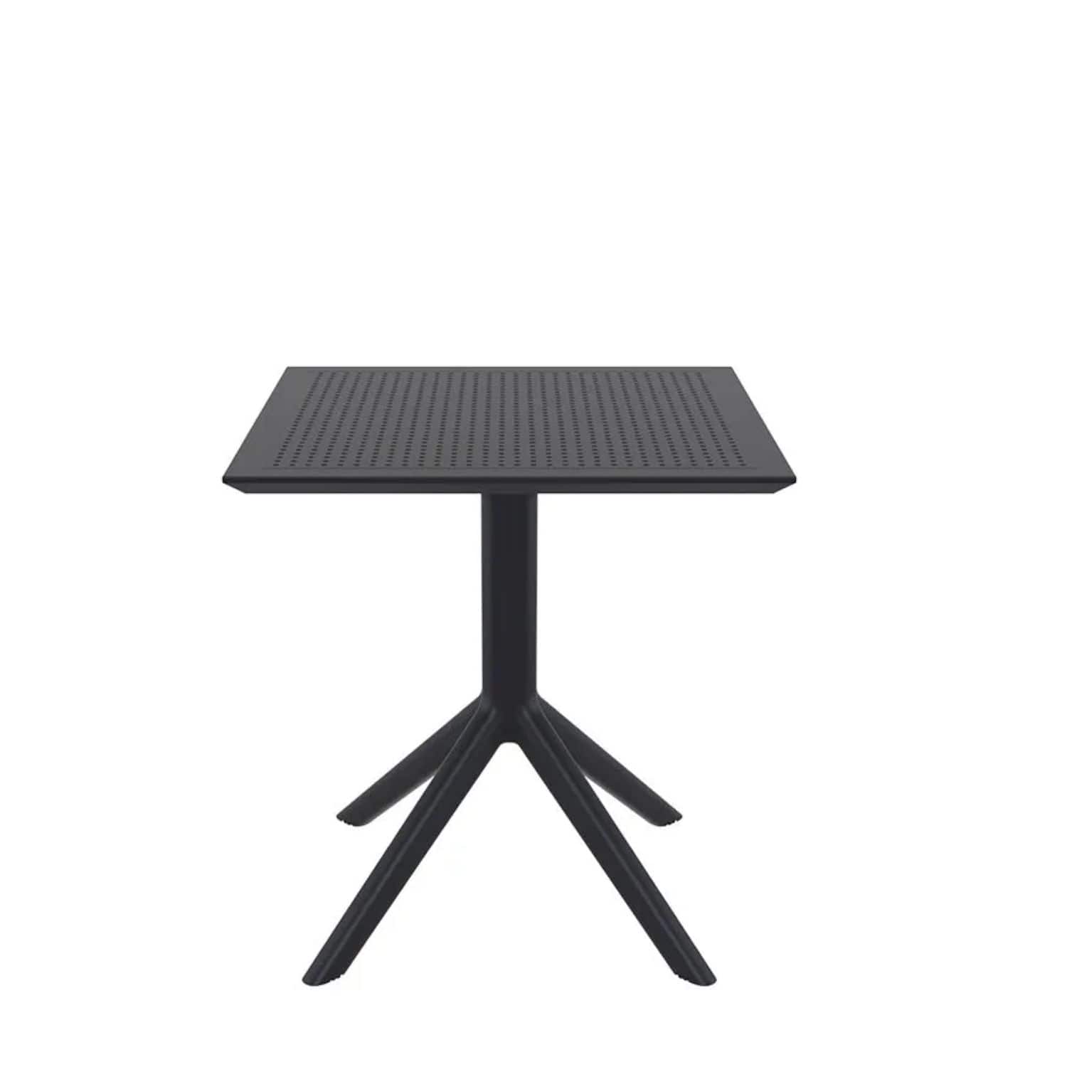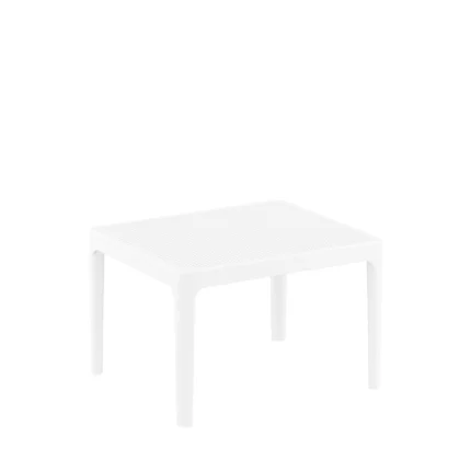 La mesa Sky está hecha de resina resistente a la intemperie. El marco metálico es aprueba de oxidación. Cuenta con protección a los rayos UV, lo que asegura una permanencia de los colores. Es desarmable y puede ser usada en interior o exterior. Disponible en una variedad de colores.