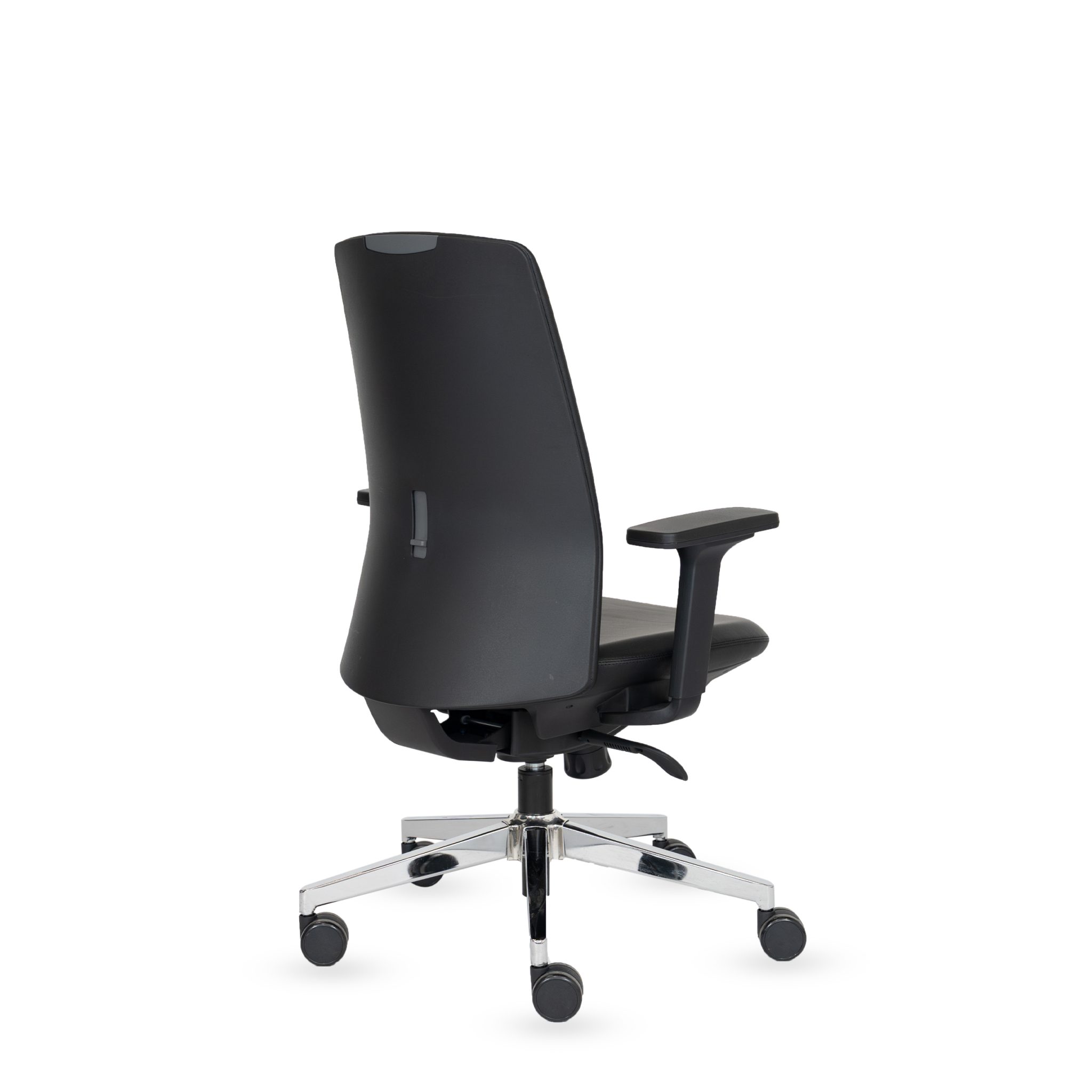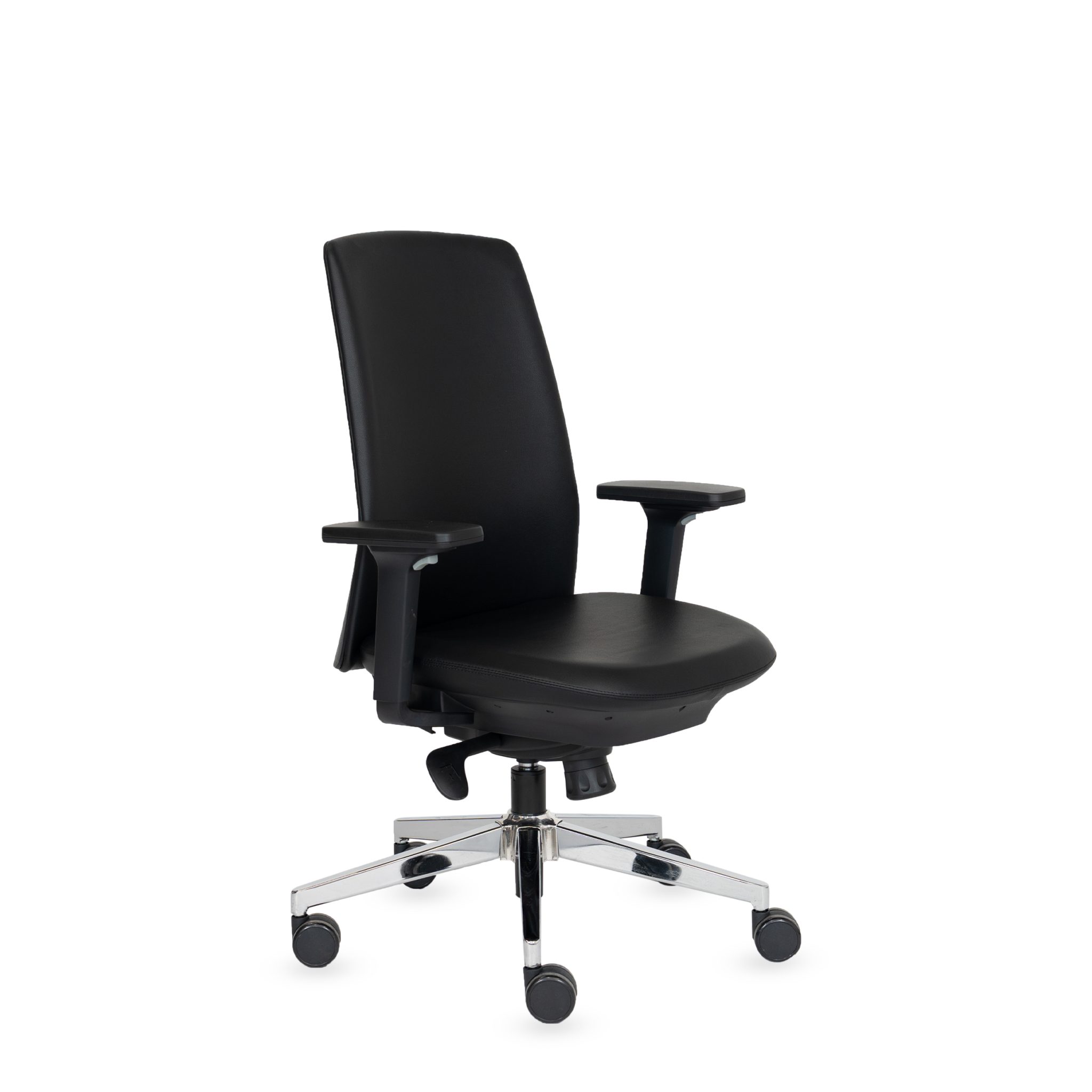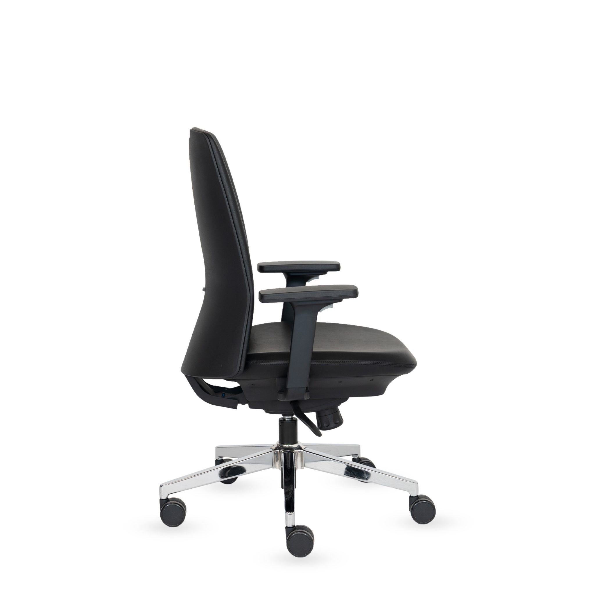 Silla BASE en piel sintética negra con reclinado sincronizado. Asiento giratorio de altura ajustable. Brazos de altura ajustable. Base en aluminio.