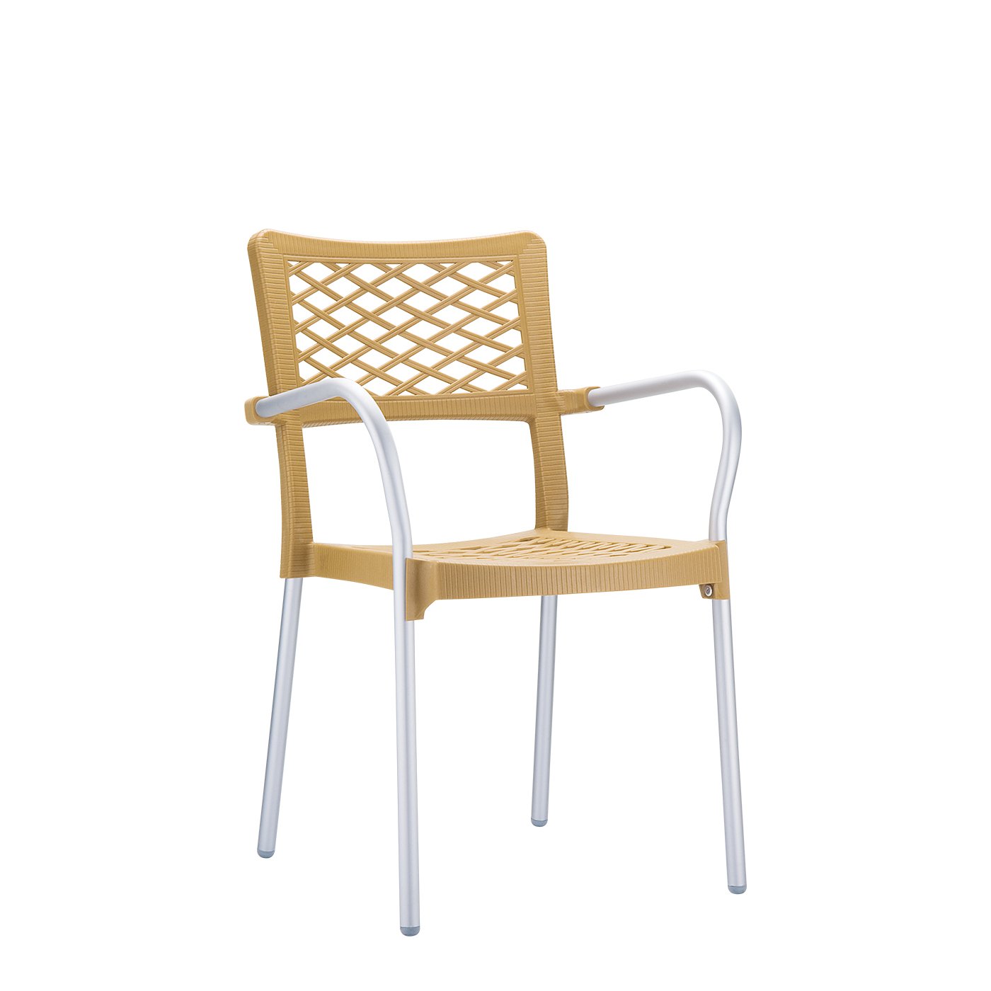 Sillón apilable de aluminio anodizado con asiento y respaldo en polipropileno, fabricado con la última generación de inyección de termoplástico moldeado por aire. Diámetro 25 mm. Para uso interior y exterior. Disponible en varios colores.