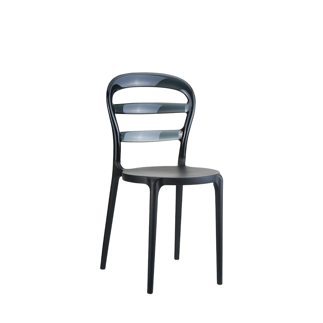 Silla apilable con inyección de termoplástico moldeado de última generación. Asiento en polipropileno reforzado con fibra de vidrio y respaldo en policarbonato transparente. Para uso interior y exterior. Disponible en una variedad de colores