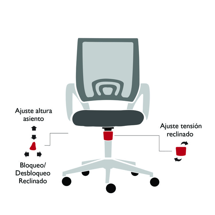 | Características | Ajuste altura asiento, Ajuste tensión reclinado, Bloqueo / desbloqueo reclinado, Con ruedas, Giratorias |