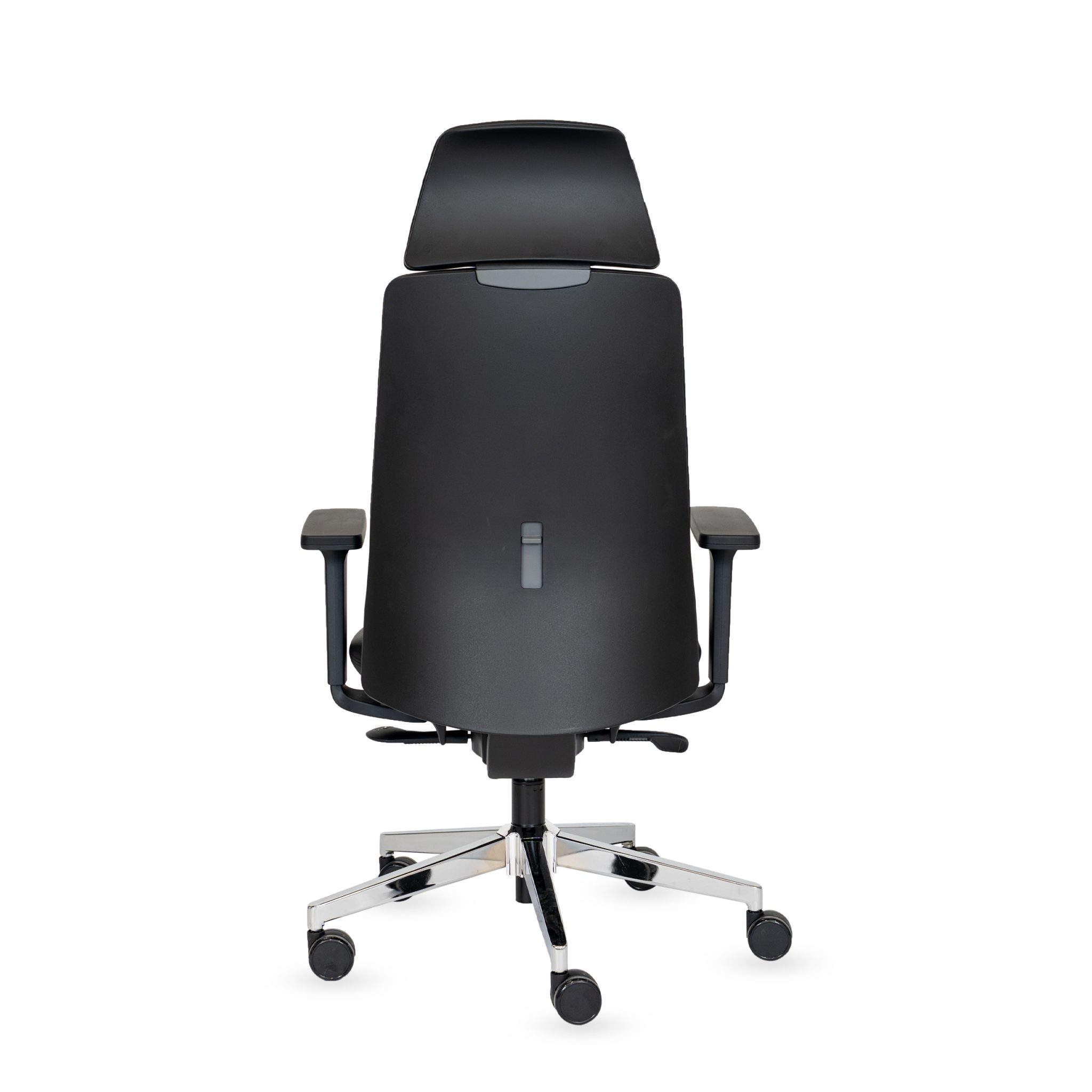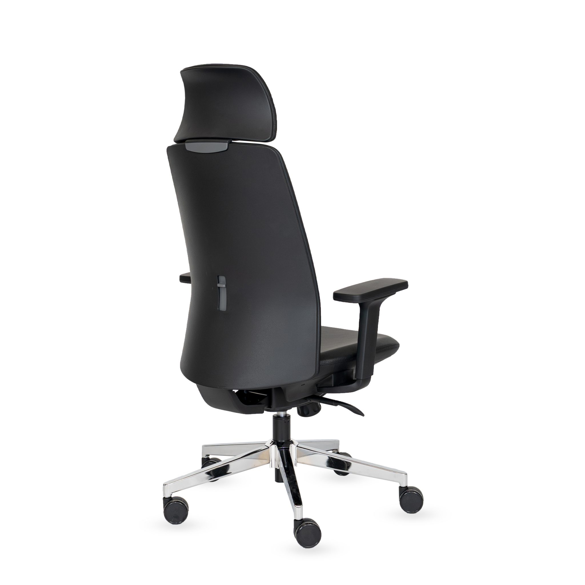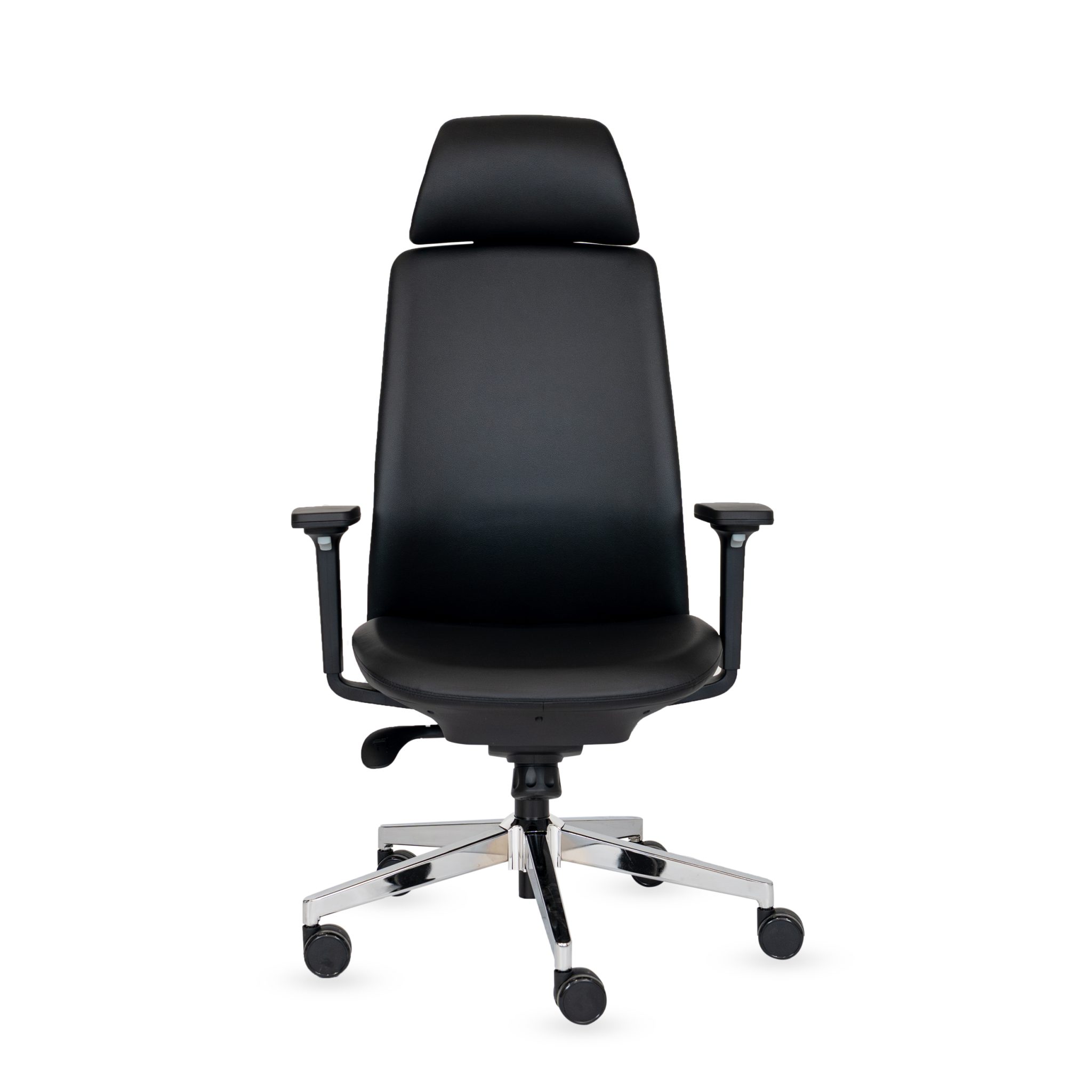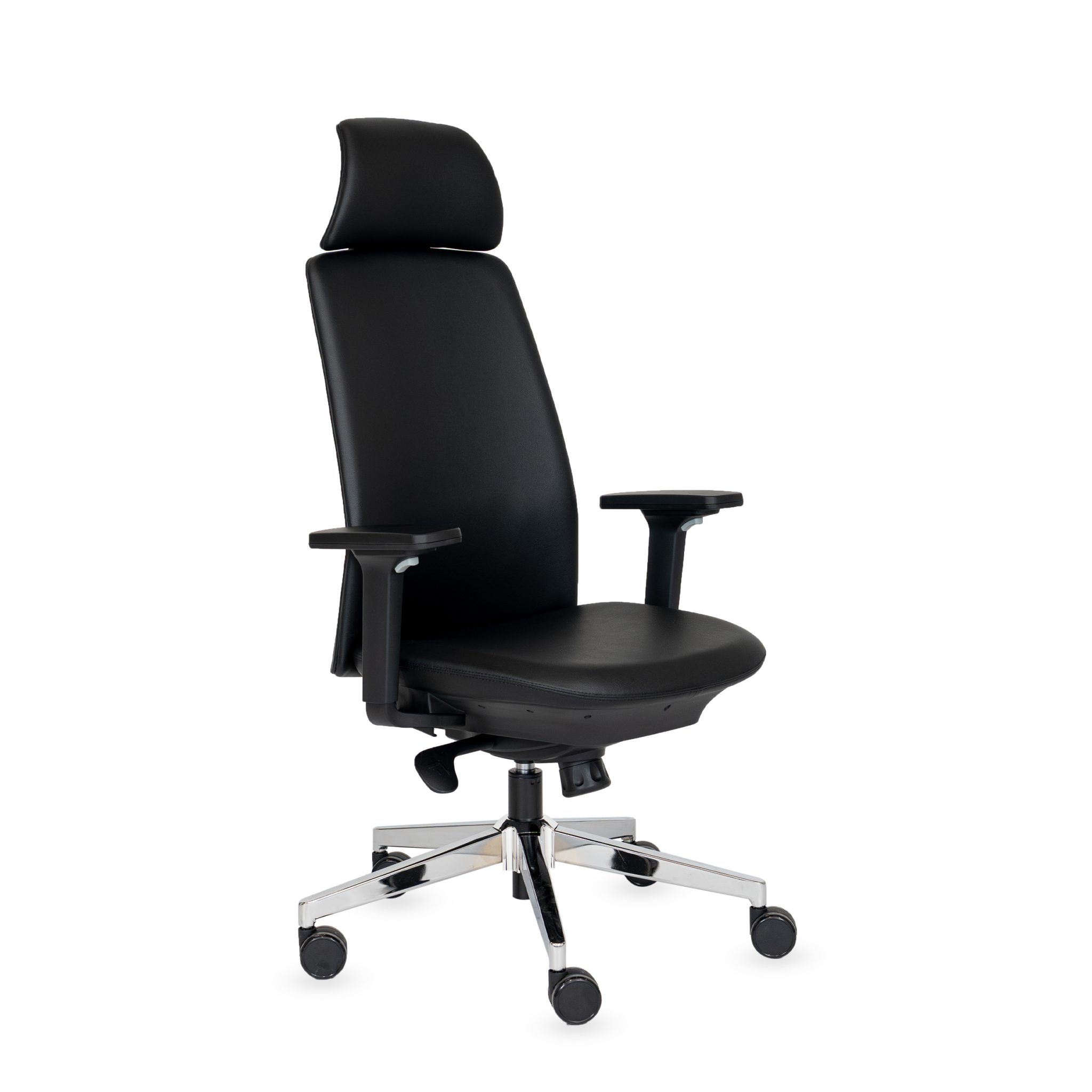 Sillón SLATE con asiento y espaldar en piel sintética negra, reclinado sincronizado y soporte lumbar ajustable. Asiento giratorio de altura ajustable. Brazos de ángulo y altura ajustable. Descanso para cabeza ajustable. Base en Aluminio.