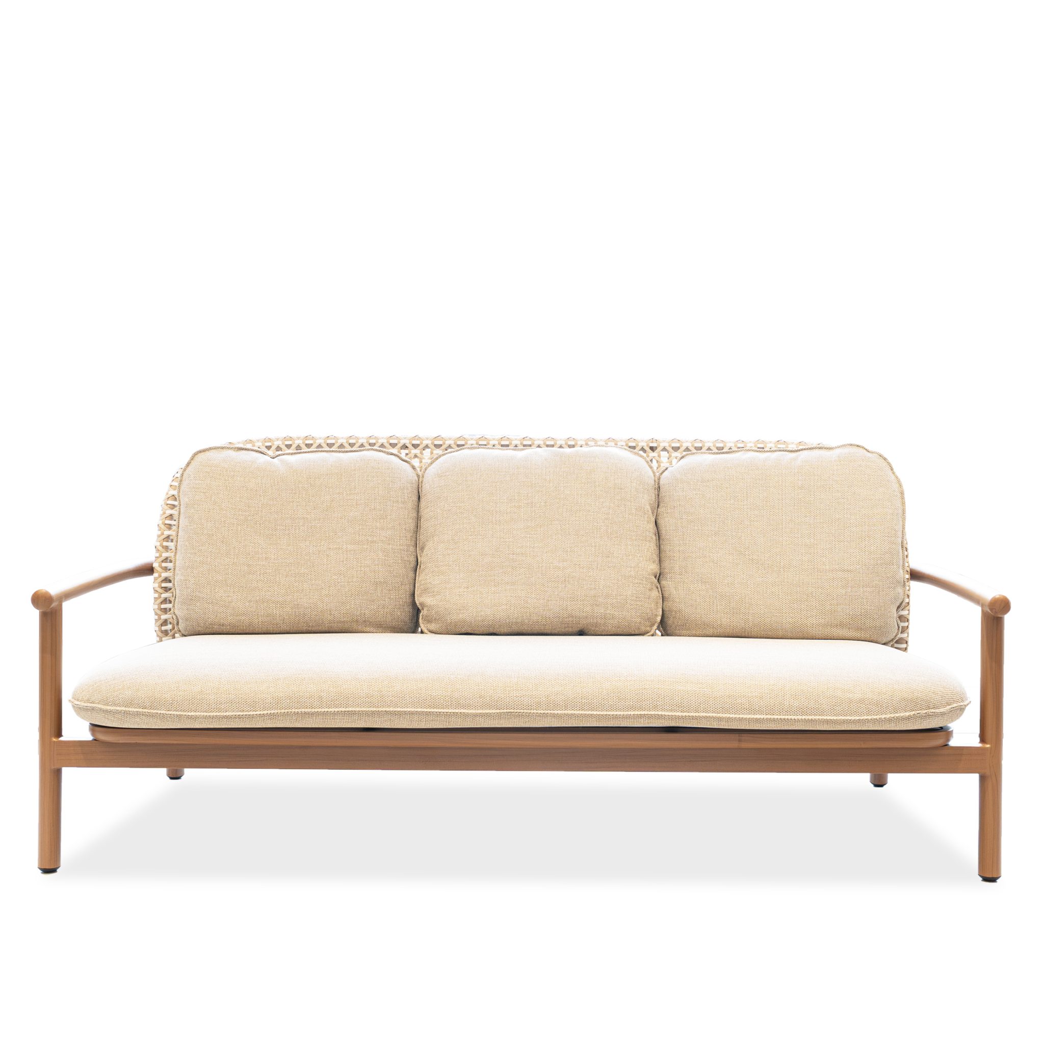 Sofá de 3 personas SOLE en asiento y espaldar elaborados en fibra sintética trenzada color Pecan con base de aluminio con acabado efecto madera.