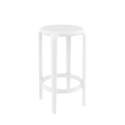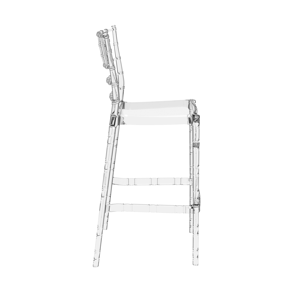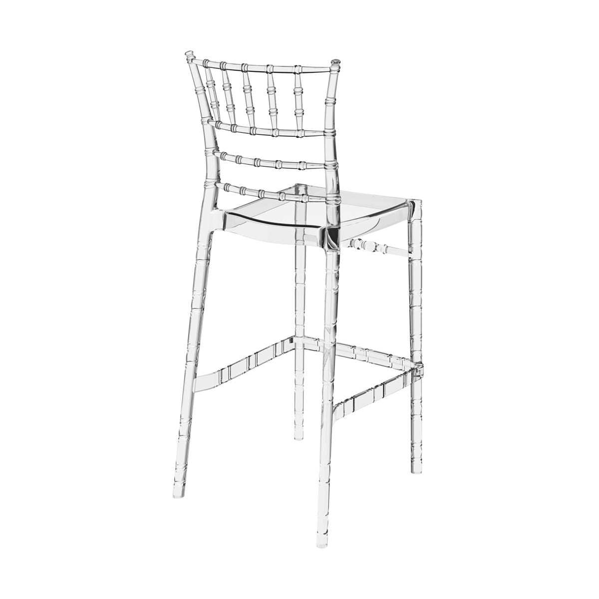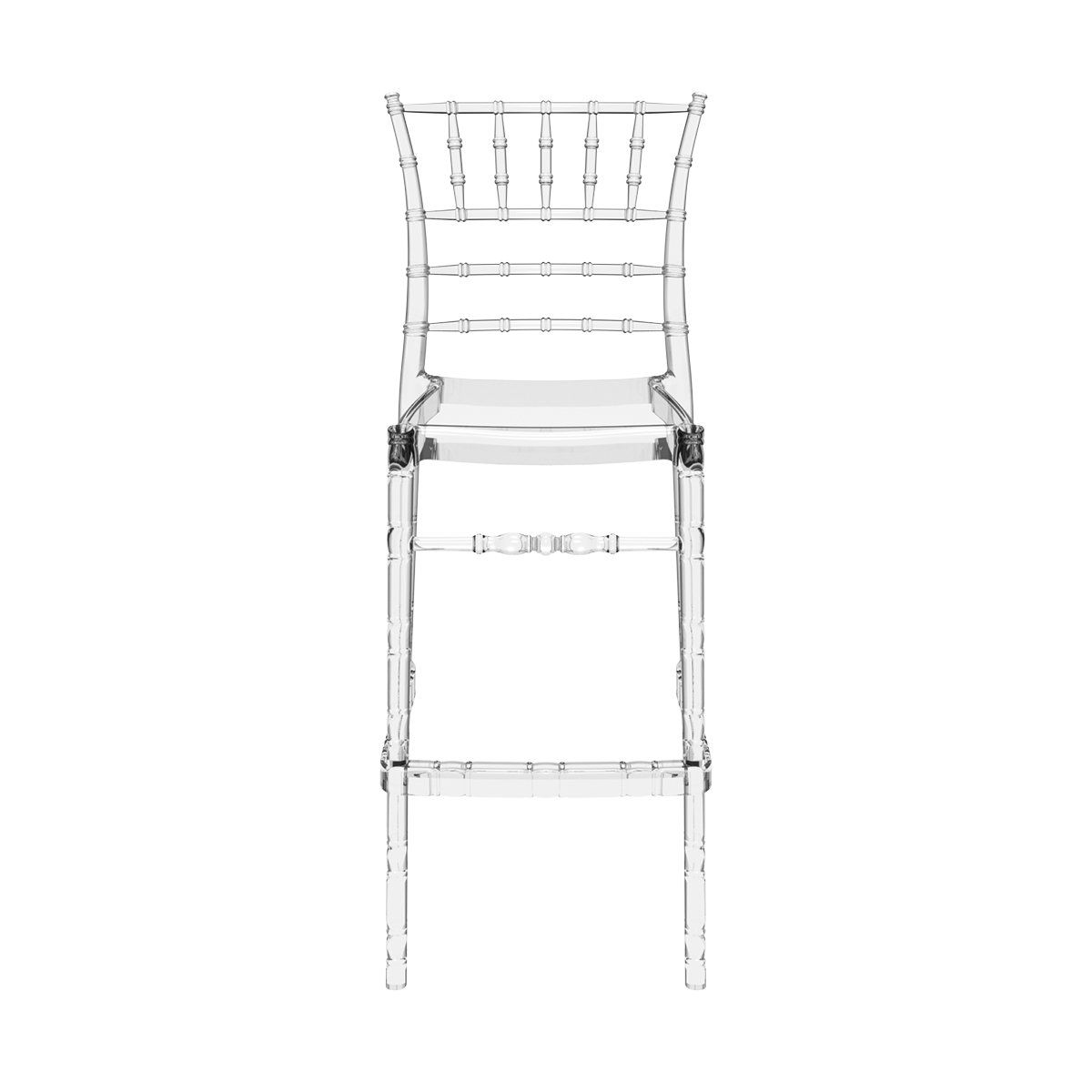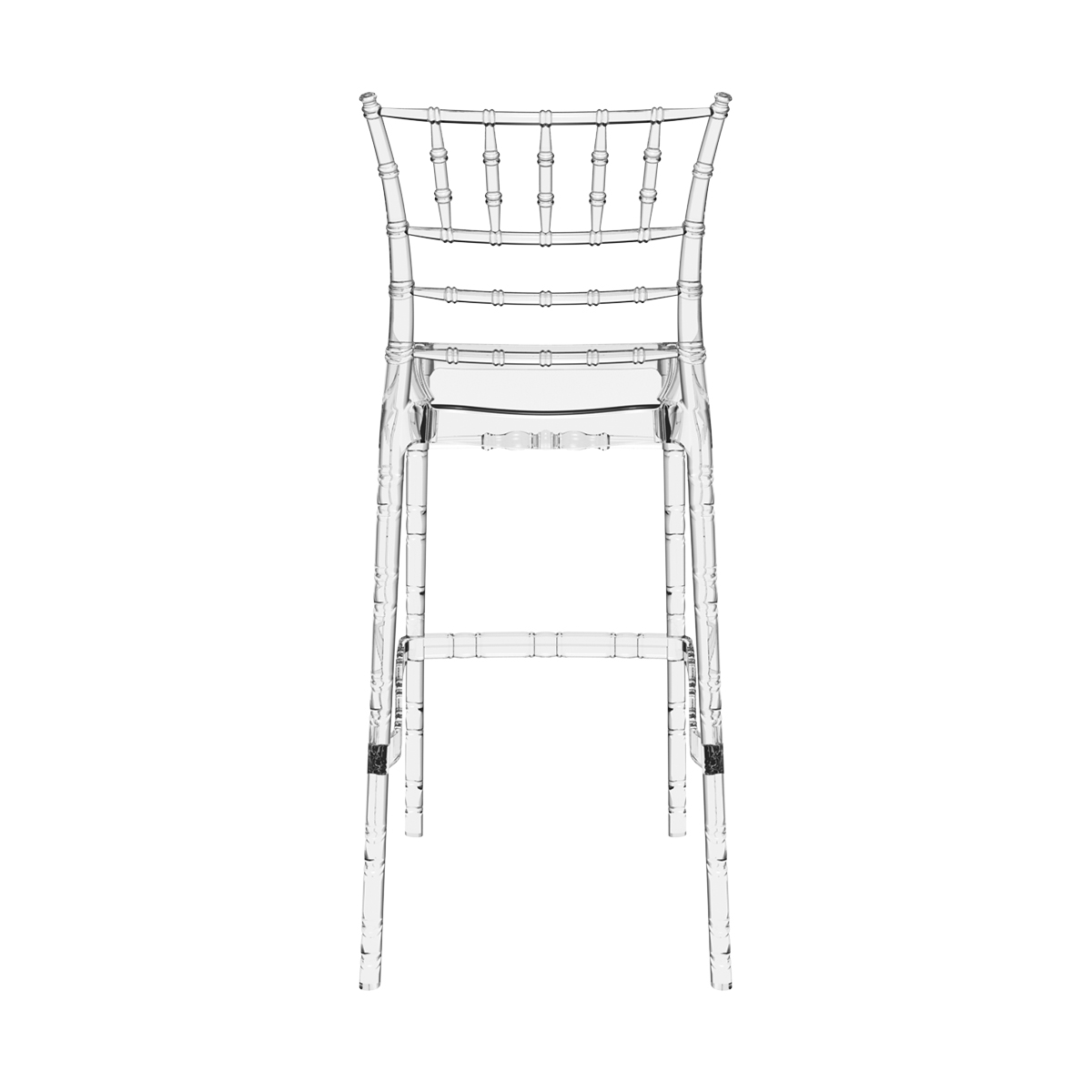 Taburete de bar apilable de 0.75 cm de alto, para uso en interior y exterior, en policarbonato transparente o brillante. Resistente a rayones y a los rayos UV. Disponible en variedad de colores.