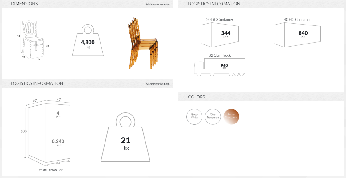 Silla apilable para uso en interiores y exterior, en policarbonato transparente o brillante. Resistente a rayones y a los rayos UV.